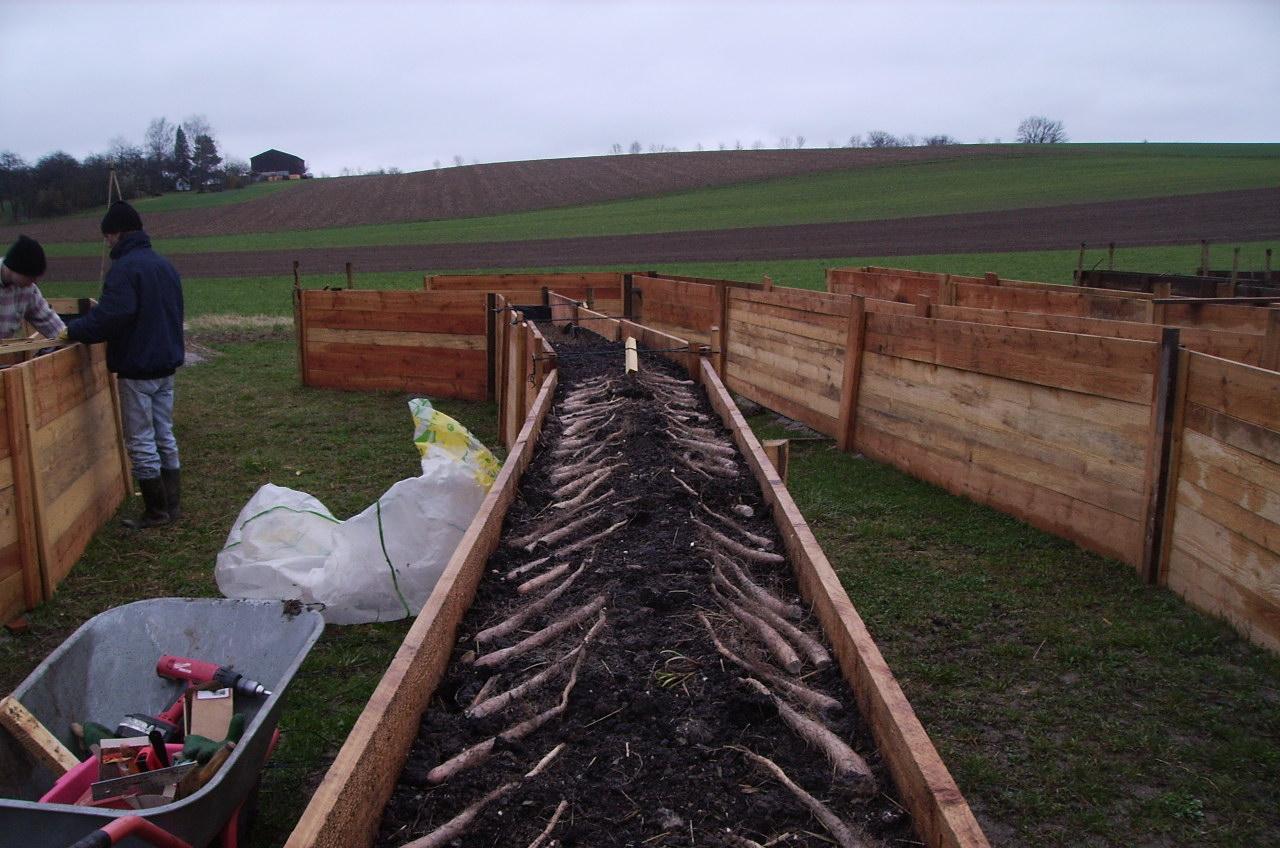 Die Gräben, bei der Grabenkultur, werden bis 10cm über Erdniveau mit Sand gefüllt. Die Umrandung ist 30 - 40 cm hoch und wird, vorläufig, bis 10cm unterhalb der Kante, mit reifem Kompost gefüllt. Das pflanzgut wird in entsprechendem Abstand auf die Erde gelegt und anschließend mit der gleichen Komposterde abgedeckt.